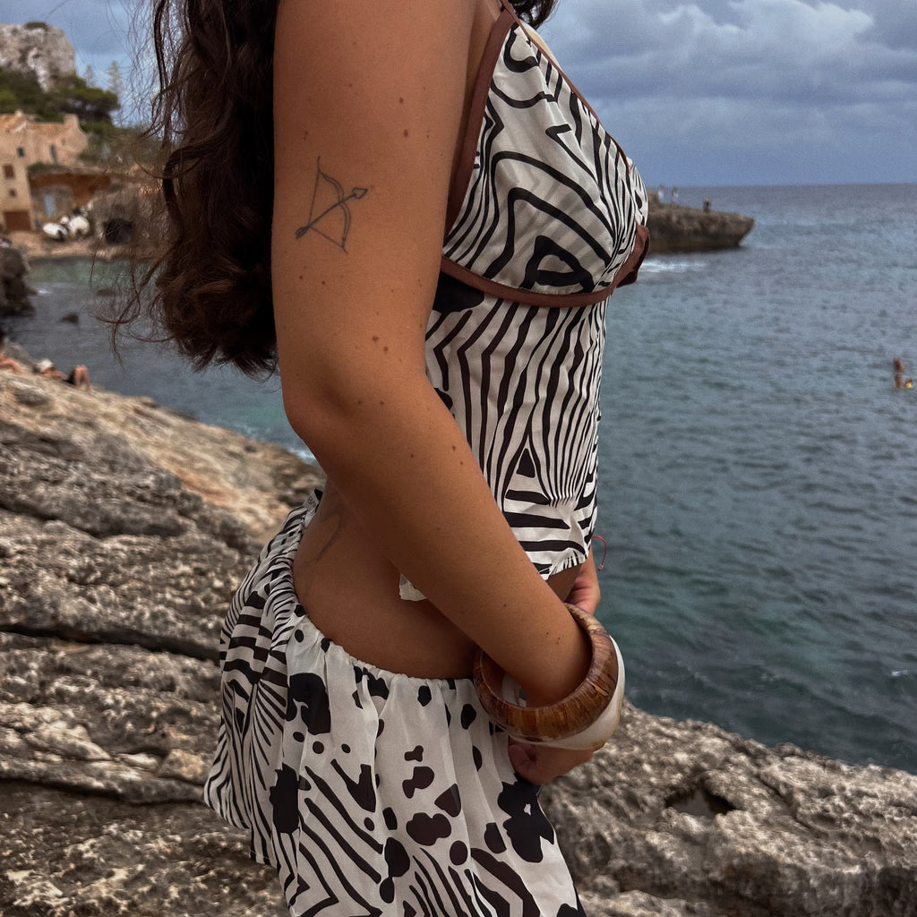 El estampado Ripples es un equilibrio entre lo que marca tendencia y lo que permanece en el tiempo. Su mezcla de patrones manchas, líneas y un sutil cebrado define una identidad única, pensada para trascender temporadas. El color base, un tono off-white ligeramente amarillento inspirado en las caracolas marinas, se combina con manchas irregulares en un marrón muy oscuro, casi negro. El diseño fue creado desde cero, con variaciones en cada prenda que aseguran la singularidad de quien la viste. Ripples representa la esencia de la marca. La unión entre fuerza y fragilidad, lo natural y lo eterno