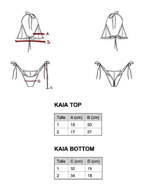 The Kaia bikini top in nude features a triangle shape with ruffle edges framing each cup. A central seam creates structure and volume. Adjustable ties at the neck and back allow for a customized fit.